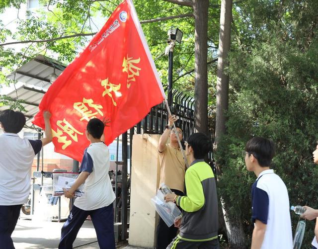 临近进场,张店八中的老师们纷纷与考生们击掌,为他们加油打气。老师们还精心准备了一份特别的礼物——一面印有“旗开得胜”字样的大旗。他们高高举起大旗,考生们有序地从旗下走过,寓意着在考试中能够旗开得胜,取得优异的成绩。