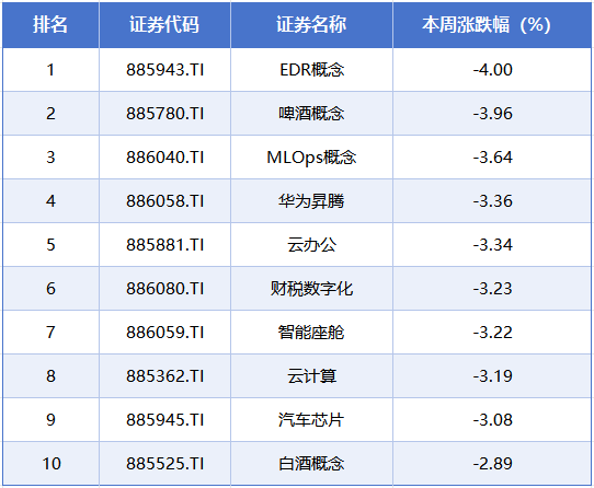 本周排在跌幅榜前排的概念板块分别是EDR、啤酒、MLOps概念、华为昇腾、云办公等概念,累计跌幅分别为4%、3.96%、3.64%、3.36%、3.34%。