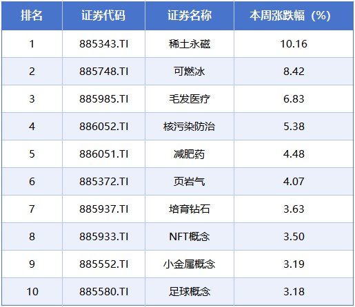 板块方面,本周涨幅居前的概念板块分别是稀土永磁、可燃冰、毛发医疗、核污染防治、减肥药等概念,累计涨幅分别为10.16%、8.42%、6.83%、5.38%、4.48%。