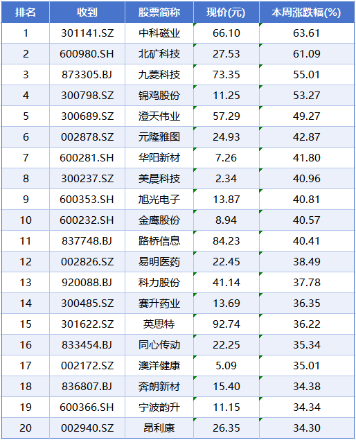 个股方面,本周个股涨幅榜前五位分别是中科磁业、北矿科技、九菱科技、锦鸡股份、澄天伟业,累计涨幅分别为63.61%、61.09%、55.01%、53.27%、49.27%。