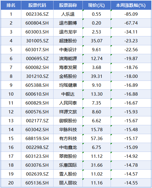 本周个股跌幅榜前五位分别是人乐退、退市鹏博、退市龙宇、超捷股份、中衡设计,累计跌幅分别为85.09%、67.74%、34.11%、23.23%、22.56%。