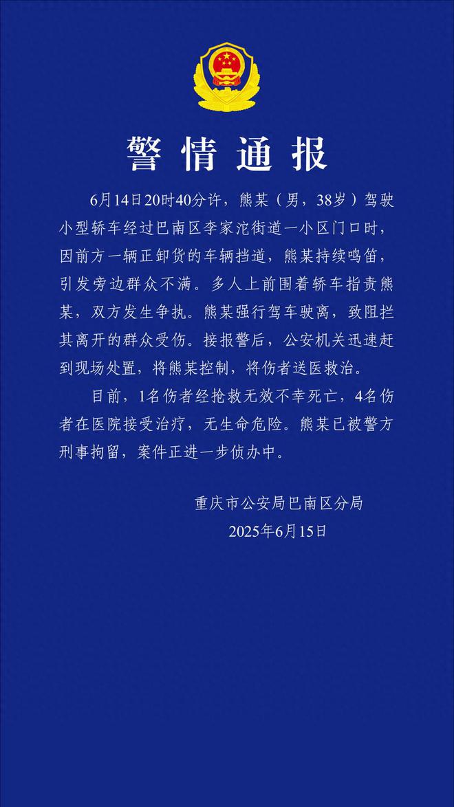6月14日20时40分许,一个38岁的司机熊某开着小车经过小区门口,前头有辆货车正在卸货,直接把道给堵死了。按说堵路了鸣笛提醒一下也正常,但他这喇叭按得有点久,旁边的人听着就不耐烦了。几个人围上去说了他几句,两边你一言我一语就吵起来了。结果熊某直接踩了油门想走,车前头拦着的人没躲开,就这么被撞了。后来听说,有一个人没抢救过来,另外四个还在医院住着,好在没生命危险,司机已经被警方刑事拘留了。