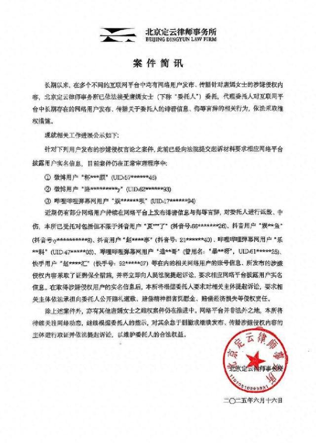 6月16日,唐嫣工作室在社交平台发布告黑维权进度公告。唐嫣工作室表示“已对互联网平台长期存在的用户发布、传播关于唐嫣的诽谤信息、侮辱言辞的相关行为,依法采取维权措施”“将继续关注网络动态,对发布、传播侵权内容的主体依法提起诉讼”。