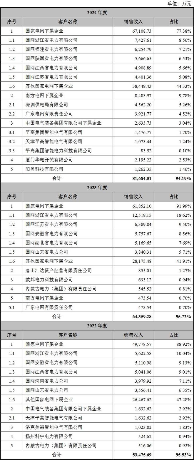 2022-2024年,公司对国家电网下属企业的销售收入分别为49,778.57万元、61,852.10万元和67,108.73万元,占公司营业收入的比例分别为88.92%、91.99%和77.38%。