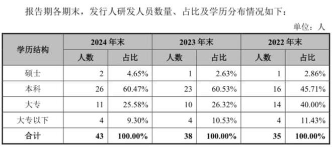 此外,公司研发人员数量远低于同行业可比公司。数据显示,在2024年末,昊创瑞通共有研发人员43名,占其员工总数比约在11.35%,2023年末和2022年末分别为38人和35人。