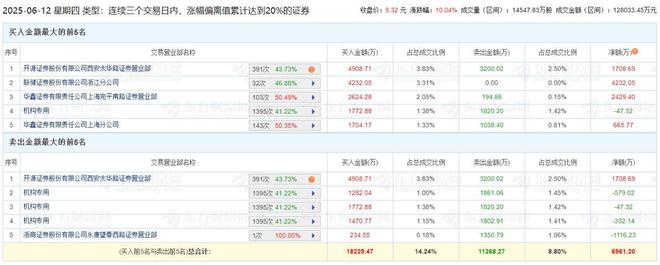 在龙虎榜成交明细中,量化打板买入4908.71万元,净买入1708.69万元;上塘路买入4232.05万元,净买入4232.05万元;炒股养家买入2624.28万元,净买入2429.40万元。卖出席位中,浙商证券永康望春西路净卖出1116.23万元。