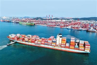 6月9日,山东港口青岛港,一艘满载外贸集装箱的货轮驶出港口。 俞方平摄(人民视觉)