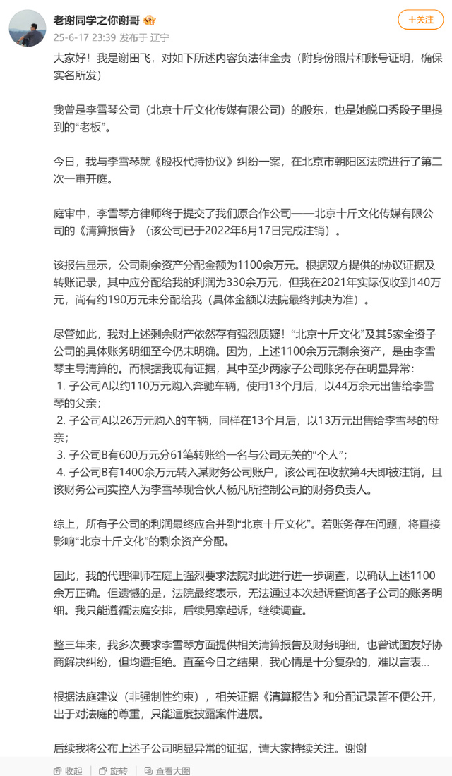 6月17日,@老谢同学之你谢哥 发布微博,其自称“曾是李雪琴公司(北京十斤文化传媒有限公司)的股东”,实名举报该公司财务问题。