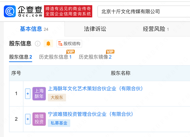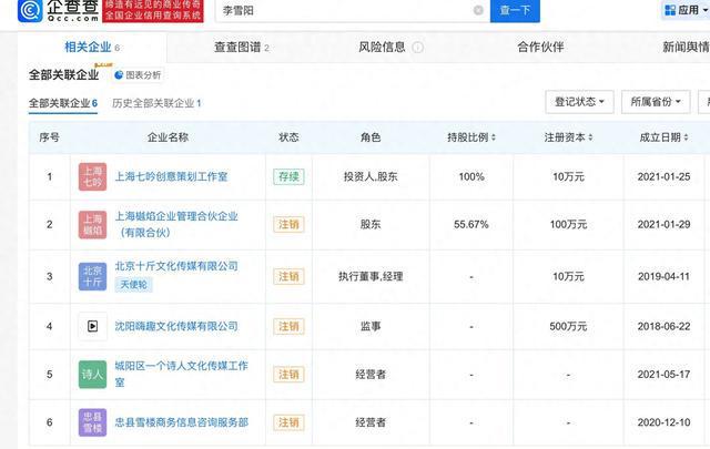 据企查查信息显示,李雪阳(李雪琴)名下关联6家公司,仅上海七吟创意策划工作室1家为存续状态,该公司成立于2021年1月,注册资本10万元。此外涉举报的北京十斤文化传媒有限公司成立于2019年4月,注册资本同样为10万,李雪阳担任法定代表人、执行董事等,宁波唯猎投资管理合伙企业(有限合伙)持有该公司10%股权。