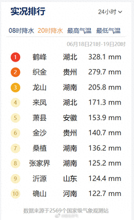 湖北的鹤峰连续2天,占据24小时降水榜全国第一。18日08时-20日08时,48小时降水量超500毫米!由于近期雨带位置稳定少动,对于近期已经连续出现强降雨地区,要格外警惕连续强降雨引发的山洪、滑坡、泥石流、中小河流洪水等次生灾害。