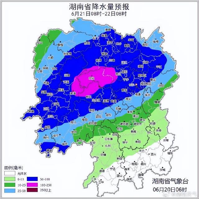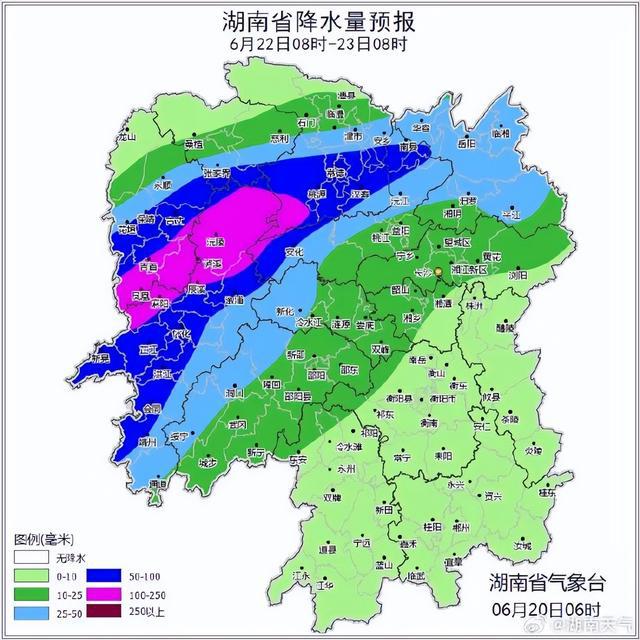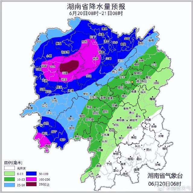 湖南省气象台预计,今天(20日)至22日湘中以北部分地区有暴雨,其中湘西州、张家界、常德、怀化北部、益阳南部有大暴雨,局地特大暴雨,并伴有8~10级雷暴大风。