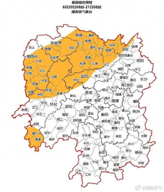 湖南省气象台6月20日06时发布暴雨橙色预警:预计20日08时至21日08时,岳阳西北部、常德、张家界、益阳、怀化、湘西州部分地区将出现暴雨,局地大暴雨,并伴有短时强降水、雷雨大风等强对流天气,请加强防范。