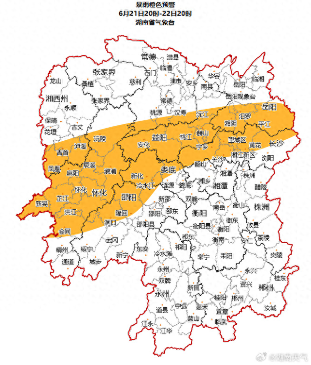自6月21日20:00至22日20:00,受降雨影响,湘西北的怀化部分山地丘陵区发生突发性地质灾害风险高橙色预警;湘西、湘西北的常德、张家界、益阳、怀化、娄底、湘西土家族苗族自治州等市州山地丘陵区发生突发性地质灾害风险较高黄色预警。