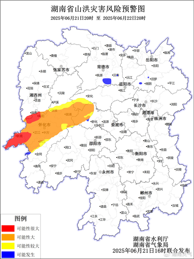 根据省气象局6月21日预报,省水利厅与省气象局联合会商得出如下结论:受降雨影响,21日20:00至22日20:00,湘西州、怀化市、邵阳市、常德市、益阳市、娄底市等局地发生山洪灾害的可能性很大,具体如下。