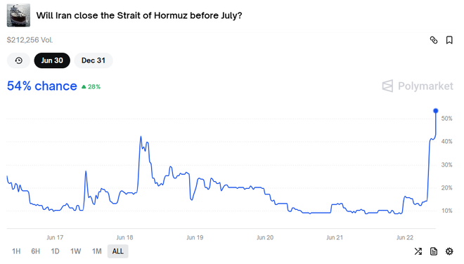 著名的在线竞猜网站Polymarket上,对于“伊朗是否会在7月前封锁霍尔木兹海峡”的概率已经升至54%,这一关键能源通道的潜在威胁引发投资者密切关注,牛津经济学分析师建模显示,在最严重的情况下,全球油价可能跳升至每桶130美元左右,这将“彻底破坏今年美国降息的任何可能性”。