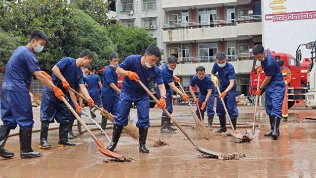 6月21日,国家消防救援局湖南机动队伍消防员在桑植县澧源镇第一小学进行清淤作业。国家消防救援局湖南机动队伍供图