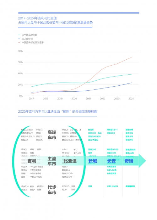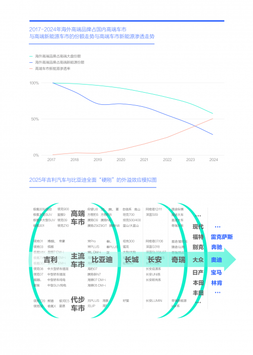 2025年尽管吉利汽车的第三轮大反攻来势汹汹,但也不乏短板:品牌整合尚处初期、燃油车占比仍较高、硬派慢半拍……而比亚迪也并未坐以待毙,2024年积极夯实主流,2025年全面发力高端,且可随时发动新一轮价格战,将全面奉陪吉利的“硬刚”。 2024年,吉利和比亚迪在国内市场的份额已接近四分之一,2025年两者的“硬刚”无异于向车市投入一枚核弹,将全面激化“节能大战”:2024年吉利与比亚迪占了中国品牌近40%份额,两者“硬刚”将重塑中国品牌阵营与助推2025-2026年中国品牌全面节能化;海外品牌占大盘与新能源的份额跌至40%、10%,吉利与比亚迪的“硬刚”,迫使海外品牌把2025-2026年新节能战略的试水期变成决战期;海外高端品牌占高端新能源份额跌破30%,利与比亚迪的全面“硬刚”和高端化战略将大幅增加2025-2026年BBA销量崩盘的风险。