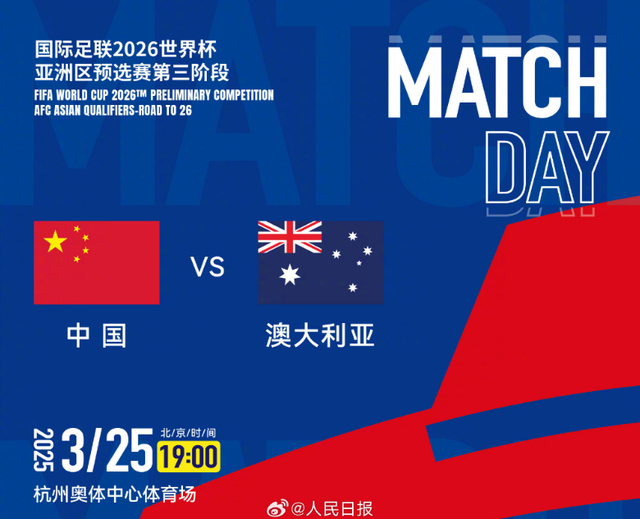 3月25日晚19时,世预赛亚洲区第三阶段C组第8轮,中国男足在杭州奥体中心体育场对阵澳大利亚。