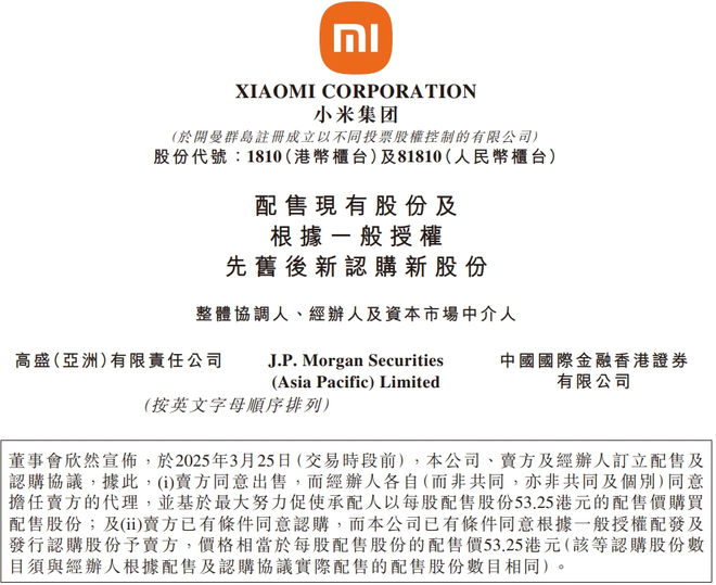 3月25日,小米在港交所宣布,已与卖方(公司控股股东之一Smart Mobile Holdings Limited)及经办人订立配售及认购协议。