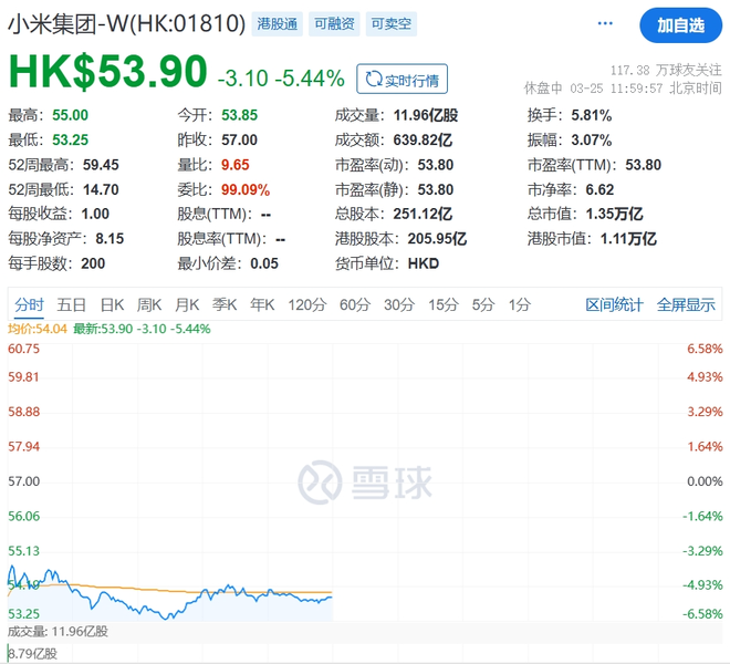 前一天有消息称,小米寻求以每股52.80-54.60港元的价格配售7.5亿股H股。
