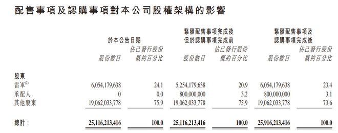 完成此次配售后,雷军的持股比例预计将减至23.4%,承配人为3.1%,其他股东为73.6%。