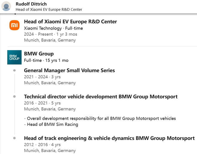 这其中包括在宝马工作了15年的Rudolf Dittrich,小米去年聘请其担任小米汽车欧洲研究中心的负责人。