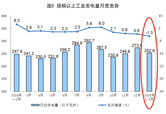 同时,就2025年1-2月的日均发电量来看,同比增长率0.4%,也接近零,这同样也是近10年来的低增长。