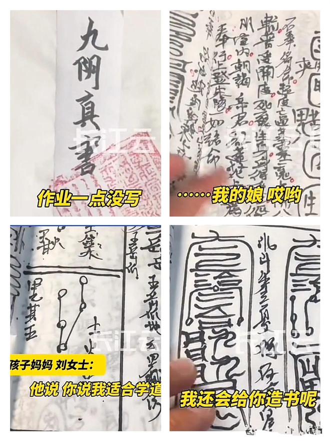 原来,儿子的同学曾说他有学道法的天赋,这可不得了,小家伙瞬间来了兴致,立志要写一本道经给同学瞧瞧。刘女士半信半疑地翻开这本“九阴真书”,好家伙,里面全是各式各样复杂的符文,密密麻麻,让人看得眼花缭乱。可更让人惊叹的是,整本书一气呵成,没有一处涂改的痕迹,而且这竟然是孩子一个晚上的“杰作”!刘女士拿着手稿,惊得合不拢嘴,原本要揍孩子的手也停在了半空,嘴里直嘟囔:“这哪像十二岁孩子写的东西啊!”