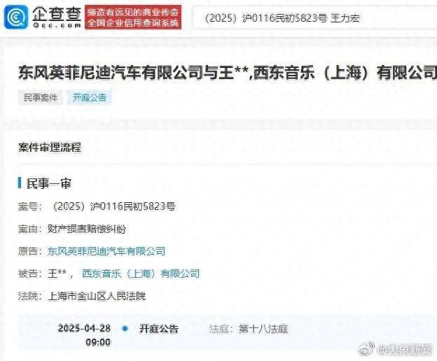 3月26日,据大象新闻消息,近日,法院公开东风英菲尼迪汽车有限公司起诉王力宏、西东音乐(上海)有限公司财产损害赔偿纠纷的案件。