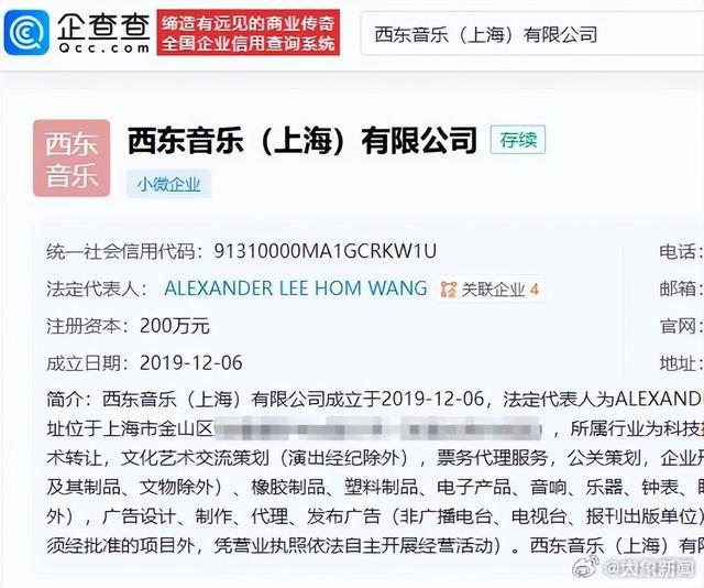 其中,西东音乐(上海)有限公司由ALEXANDER LEE HOM WANG(王力宏)担任法定代表人职务。