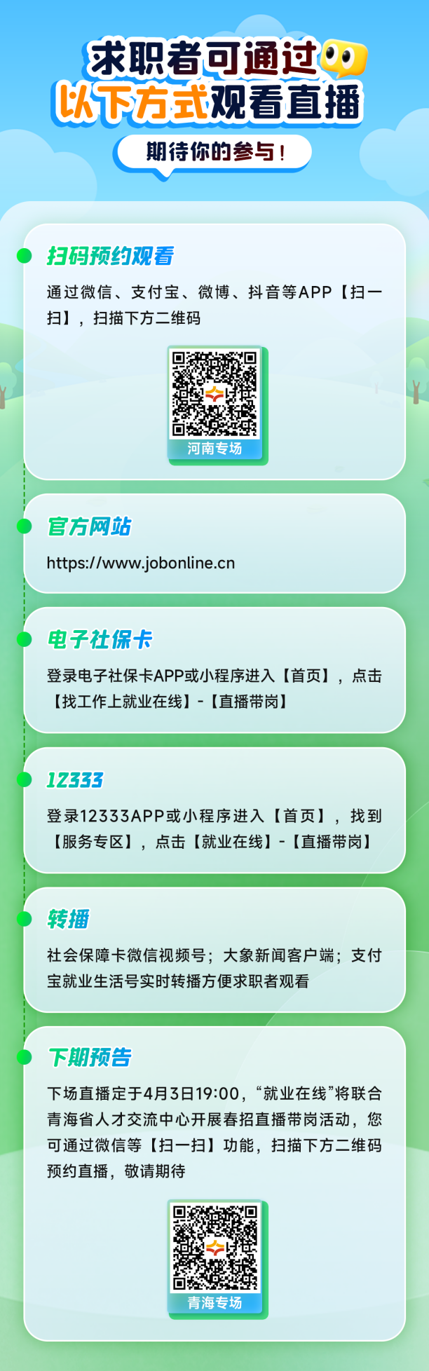 春意盎然,万物竞发,正是求职逐梦的黄金时节!为助力大学生把握春招机遇,迈向理想职业之路,“就业在线”平台开启“春招揽才 职通未来”高校毕业生春季招聘系列直播带岗活动。3月27日19:00,“就业在线”将联合河南省就业服务中心开展河南专场直播带岗,通过权威政策解读、优质岗位推荐和专业求职指导,为莘莘学子点亮职场前路,开启就业新篇章!