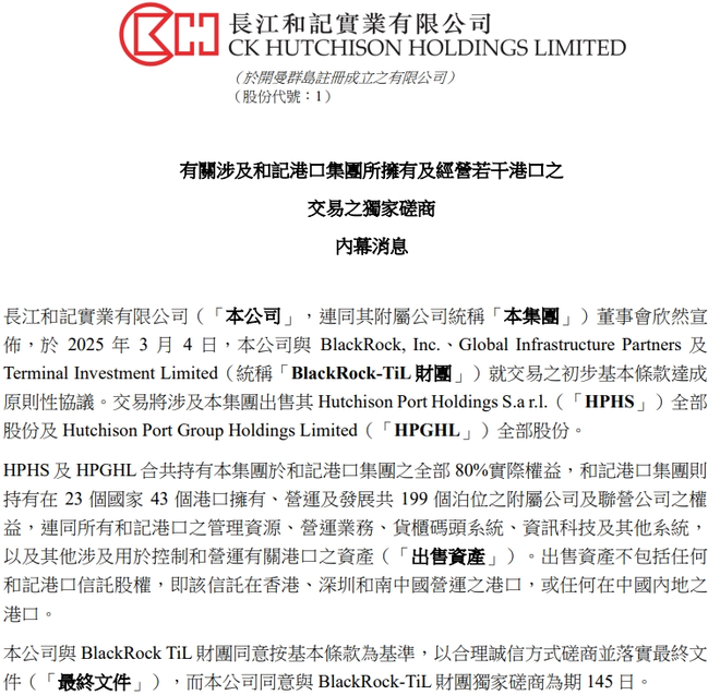 根据3月4日晚提交给港交所的文件,长和宣布将以190亿美元现金的价格向BlackRock-TiL财团出售巴拿马港口公司90%的股份以及其他一系列非中国港口。