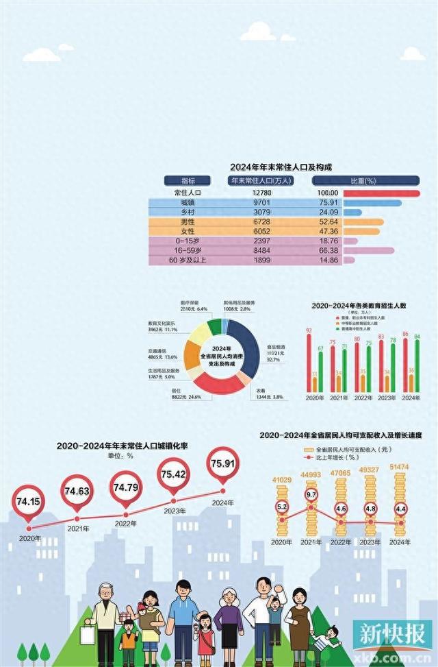 2024年,全省常住人口12780万人,比上年末增加74万人,其中城镇常住人口9701万人,占常住人口比重(常住人口城镇化率)75.91%,比上年末提高0.49个百分点。全年出生人口113.3万人,出生率8.89‰;死亡人口66万人,死亡率5.20‰;自然增长人口47万人,自然增长率3.69‰。