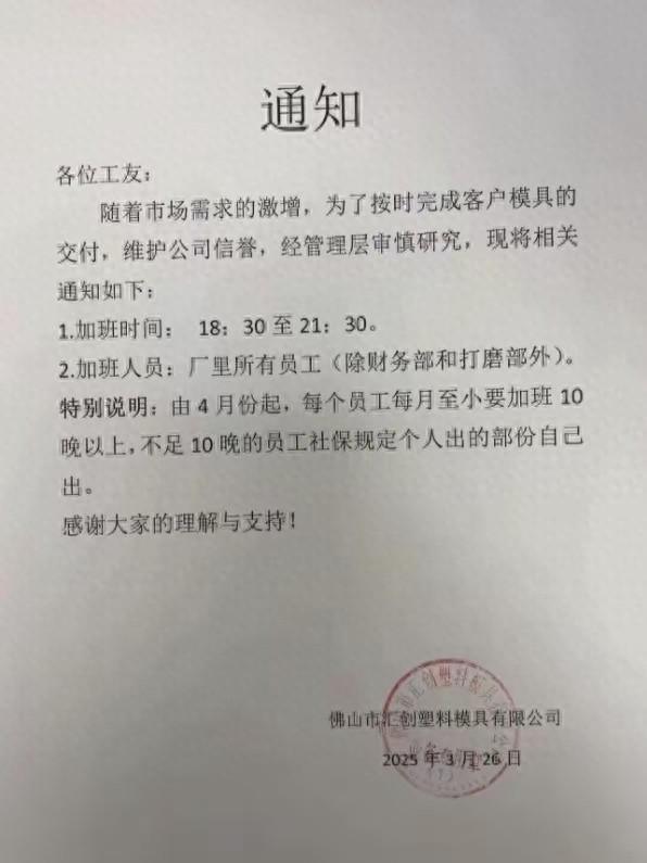 据荔枝新闻报道,近日,广东佛山汇创塑料模具有限公司下发通知,要求员工每月至少要加班10晚以上。“不足10晚的员工,社保规定个人的部分自己出”。面对舆论质疑,公司声称这是“自愿加班”,并以此为由提出所谓的“激励机制”:“如果你符合加班规定,自己缴纳的社保我们来缴纳,另外你也可以赚加班费,还能拿提成。”