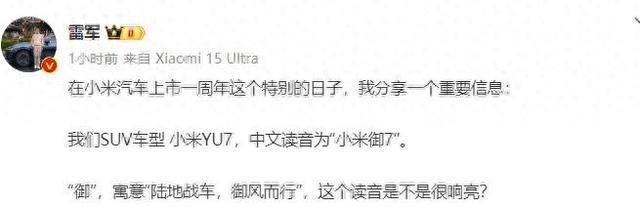 在小米汽车上市一周年这个特别的日子,我分享一个重要信息:我们SUV车型 小米YU7,中文读音为“小米御7”。“御”,寓意“陆地战车,御风而行”,这个读音是不是很响亮?