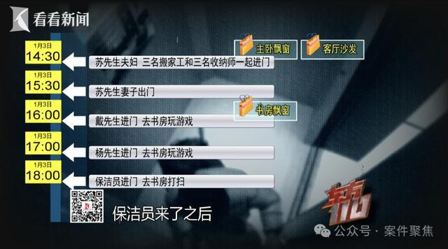 首先,警方通过梳理,分析出了窃贼能接触到手表的两个时间段。第一个是下午2点半到3点半期间,苏先生把包放在主卧飘窗上的时候,搬家工和收纳师有机会接触到包;第二个是下午4点到7点之间,包在书房飘窗上,保洁员和苏先生的两个朋友,戴先生、杨先生都有机会作案。而苏先生的另外3个朋友,很晚才到苏先生家,且没有进入过放包的房间。