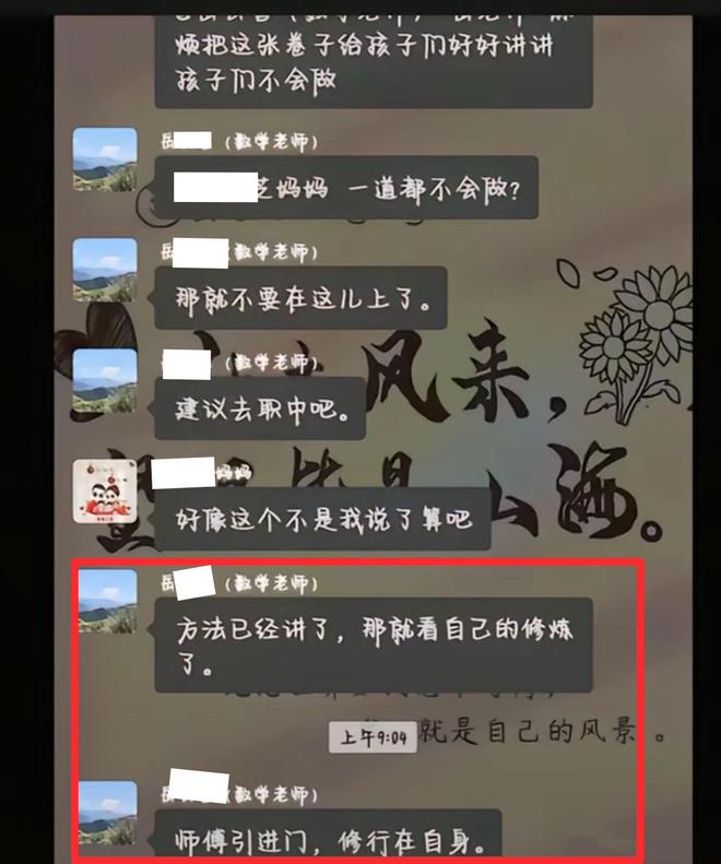 随着事情发酵,班级群完整聊天记录流出,这下大家看到了更多细节。原来岳老师怼完家长后,马上解释那些题目的方法都讲过了,学生得靠自己琢磨,毕竟“师傅领进门,修行在自身” 。可惜这些解释在一开始媒体报道时被忽略了。一位山西本地网友还爆料,说这个要求讲试卷的家长,孩子考试才考十几分,上课还老睡觉。这下大家恍然大悟,老师当时的反应似乎也情有可原了。