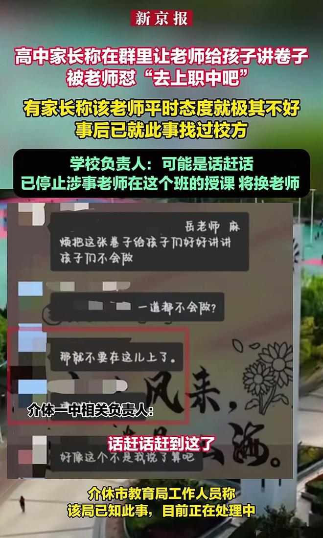 事情并没有因为这几句对话结束。不知道是不是哪位家长把这事捅到了网上,还向学校投诉了岳老师。这下,事情闹大了,引发了全网关注,还上了热搜。不少家长觉得是老师和家长沟通出了问题,老师的态度太冲,完全不顾及家长的感受。学校迅速做出回应,责令岳老师停了这个班的课,打算换一位老师。教育局也介入处理,看来这事在学校层面算是“一锤定音”了。不过学校工作人员也无奈地强调,群里聊天就是话赶话,大家都在气头上。