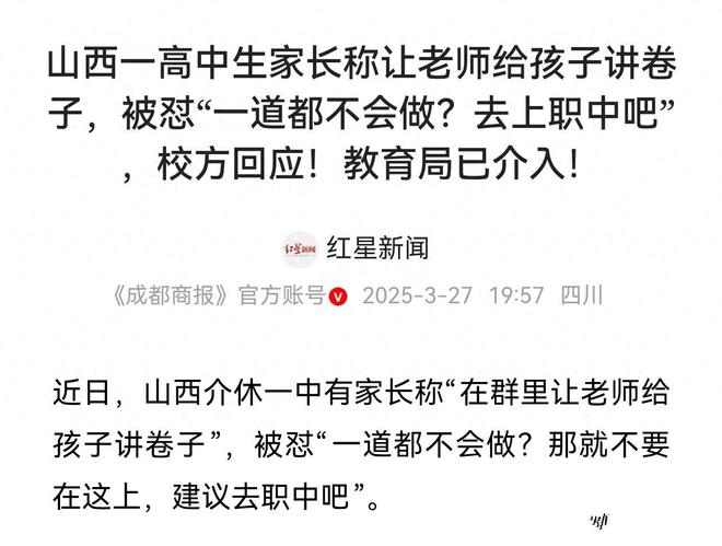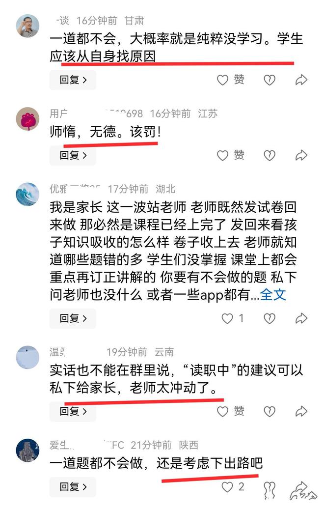 这事儿在网上掀起了轩然大波,网友们分成了好几派。一部分网友觉得老师太冲动,不管怎么样,都不该这么怼家长,这太不专业了,必须得罚。但更多网友却觉得老师话糙理不糙。有人吐槽:“都高中生了,要是整张卷子都不会做,去职中确实是个选择啊!家长也得认清现实。”还有人替老师叫屈:“老师下班时间又不是家长的私人时间,哪能说支配就支配?而且说‘好好讲讲’,听起来就像在指责老师不负责,老师心里能舒服吗?”