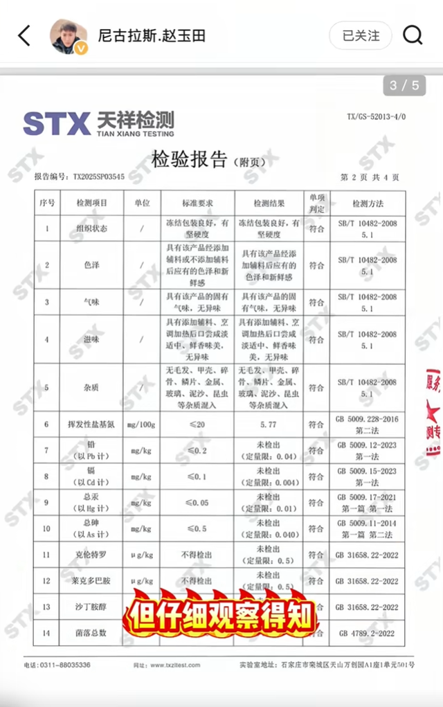 3月6日,“赵玉田”在社交账号发布一份合格的产品检测报告。然而沈先生称,自己举报的是产品非法添加保水剂,这份检测报告检测的是菌落总数。