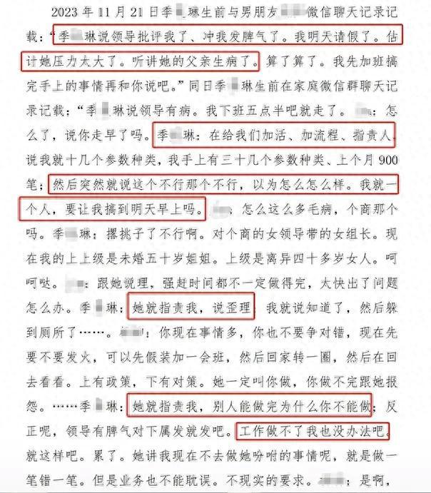 合肥市包河区法院今年1月22日作出的一审判决书显示,警方的《报警记录》载明,小琳近期因工作压力过大、筹备婚礼等原因,导致情绪不好,无法正常睡眠,2023年11月22日到滨湖医院就诊,23日下午从自己房间窗户跳楼坠亡。小琳生前工作区域的监控视频记载,被告陈某某于当月20日、21日、22日在工作时间多次与小琳进行长时间谈话交流。原告提交的小琳与男友及在家庭群内发布的聊天记录中,小琳多次提到提出请假后,被领导派了大量工作并遭到指责。比如小琳在家庭群内说,“我坚持不了了,被讲的拉肚子”“我去开个病假条吧”“是不是想把我逼走”。