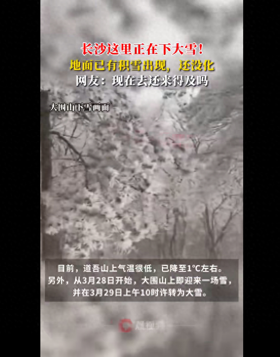 3月30日,有网友反映浏阳城区的道吾山上正在下雪:“昨天下了一晚上,今早八点又开始下大雪。”道吾山天湖片区项目负责人表示,山顶已经有一层薄薄的积雪了。目前山上气温已降至1℃左右。