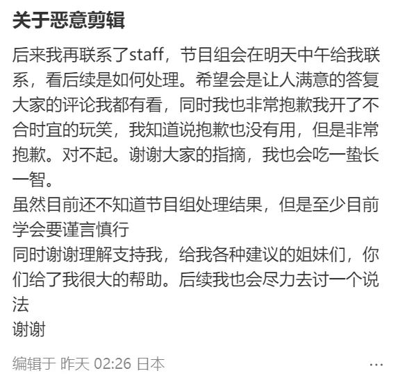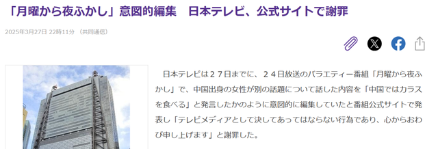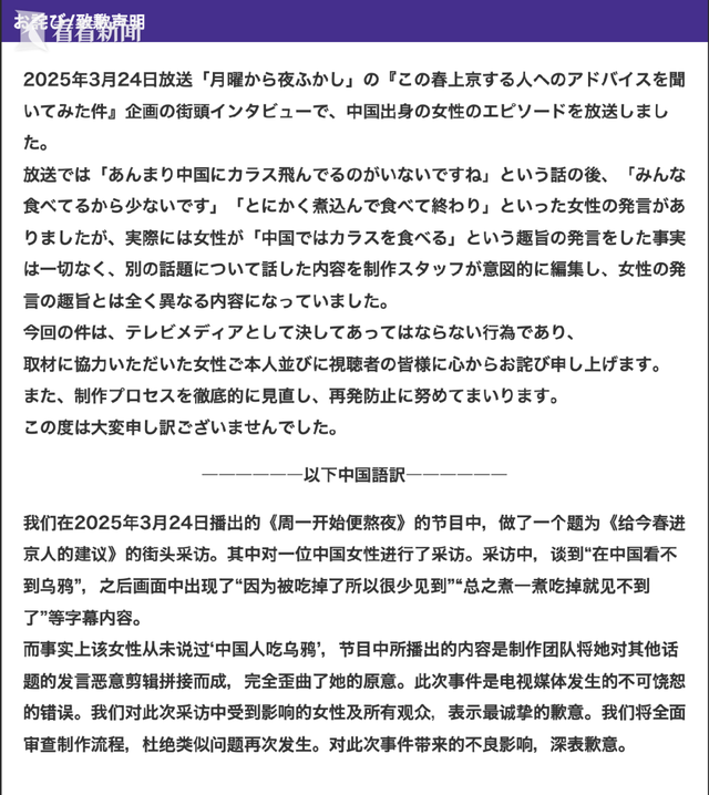 27日,该节目组所属日本电视台在官网用中日双语道歉称,这名女生从未说过“中国人吃乌鸦”,制作团队恶意剪辑完全歪曲了她的本意。道歉称,这是电视媒体不可饶恕的错误,对这名女生和所有观众表示最诚挚的道歉,今后将全面审查防止再犯。