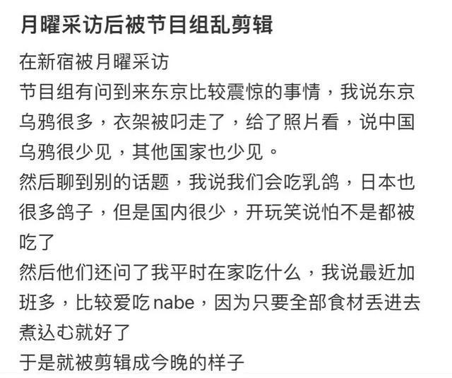 在节目的播出版本中,她的画面被重新拼接,字幕赫然写着:“在中国街头几乎见不到乌鸦,因为都被人吃掉了。”“总之就是煮一煮吃掉,就没了。”