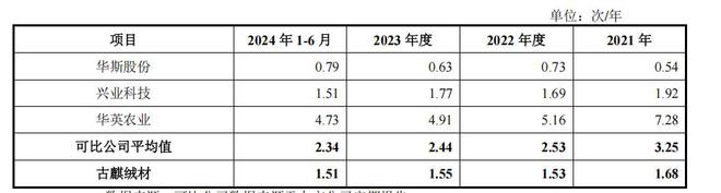 在存货不断增加的情况下,但古麒绒材在存货周转方面做得并不好,存货周转率低于行业均值。2021年至2024上半年,古麒绒材存货周转率分别为1.68次、1.53次、1.55次和1.51次,低于可比同行2.34次、2.44次、2.53次、3.25次的平均水准。