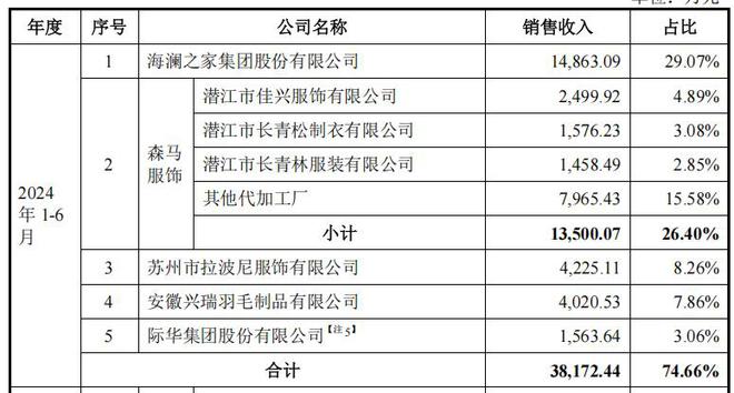 2001年成立的古麒绒材,在2010年就揽下了海澜之家的合作,随后拓展至森马、波司登等品牌。其招股书数据显示,2024年上半年,海澜之家和森马服饰两家联手为古麒绒材贡献了一半的营收。