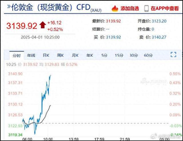 4月1日上午10点25分,黄金涨至3139.92美元的新纪录高位。