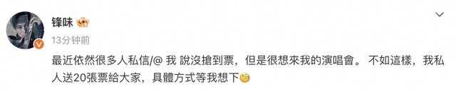 4月2日,谢霆锋在个人社交账号发文:最近依然很多人私信我说没抢到票,但是很想来我的演唱会。不如这样,我私人送20张票给大家,具体方式等我想下。”
