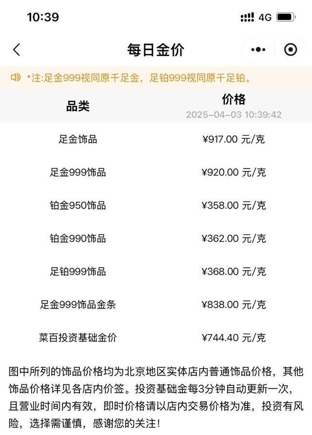 中新经纬查询菜百首饰小程序发现,截至4月3日10时39分,足金999饰品报价920.00元/克,足金饰品917.00元/克,足金999饰品金条838.00元/克,菜百投资基础金价744.40元/克。