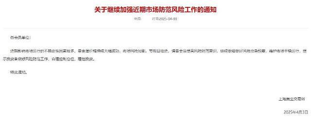 上海黄金交易所3日发布《关于继续加强近期市场防范风险工作的通知》称,近期影响市场运行的不确定性因素较多,贵金属价格持续大幅波动,市场风险加剧。节假日临近,请各会员提高风险防范意识,继续做细做好风险应急预案,维护市场平稳运行,提示投资者做好风险防范工作,合理控制仓位,理性投资。